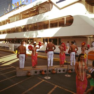 A bus picked us up from the hotel and took us to the port. Before boarding the ship, we were welcomed by dancers and live music. I thought we would be able to take a photo with the captain, but it turned out that those on the cheapest course were not allowed to do so. There was also no lei service, so I regretted not buying one.