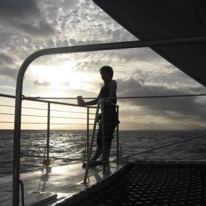 友人の誘いでこのツアーに行くことになり、行く前は船酔いしないかなーと心配でした。しかーし、風と一体になってクルージングしていたらそんな心配ぜんぜん必要なしでした。まず、船が新しくきれいで、トイレもちゃんとしたトイレが完備され、おやつのデニッシュ、フルーツもおいしく、飲み物もアルコール以外はフリーです。ケワロ湾を出航し、沖に向かってまっしぐら。出航時にはエンジンを使用しますが、沖にでたら帆をはって風をいっぱいに受けて走ります。波を乗り越えかなりの迫力です。船のへさきにネット状になったところがあり、そこに座ると波がすぐ下に見えて まるで自分がトビウオになったよう。(波しぶきをかなりかぶりますが・・・・)船のスタッフもフレンドリーで船長さんは日本語も話せます。まるで知り合いのヨットに招待されているような そんな気分でした。大きな船では味わえない風との一体感に本当に癒されました。