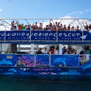 小学生と高校生の息子達を連れて家族で参加しました。船に乗って間も無くイルカが近くにいるとの事。2回トライしてたくさんのイルカを見る事が出来ました。群れの中に赤ちゃんイルカもいて可愛いかったです。その後場所を変えてのシュノーケルではウミガメやお魚たちも見られたし、子供達も大興奮でした。船の上で食べたチーズバーガーがとても美味しかったです。大満足のツアーでした。