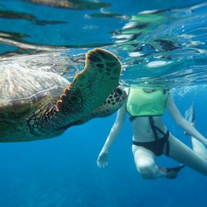 船の上から念願の野生イルカを見れた時にはとてもテンションが上がりました。大勢の群れでピョンピョン飛び跳ねながら、たまに水族館のショーみたいにツイストジャンプまで見せてくれて感激しました。実際海に入ってからは、一度しかイルカの群れを見る事が出来ませんでしたが、自分が浮いてる真下をイルカの大群が泳いでいきました!iPhoneを防水ケースに入れて持って行きましたが、水中ではうまく操作が出来ず携帯ではイルカの写真を撮る事ができませんでした。はやり海中で写真をとるなら水中カメラがオススメです。ウミガメには何度か会えました。私たちがプカプカ浮いている所に泳いでくるので、危うく触れてしまうのではないかとヒヤヒヤしました。