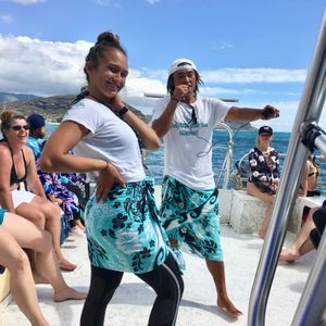 This tour is more of a picnic on a boat off the coast of Oahu rather than a dolphin-watching tour, so in that sense, it offers entertainment and could be enjoyable for those who are not used to being on the water. If you go in with the mindset that seeing dolphins would be a lucky bonus, you won't be disappointed. It was completely different from the dolphin tours on the Big Island. The staff followed the company's concept of providing entertainment, but at times their individuality came through, which I found a bit immature.
