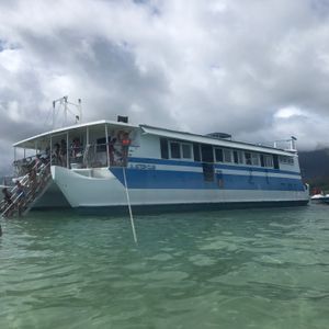 一人での参加だったが十分楽しむことができた。私はSUPとカヤックとシュノーケルをしたが、全てサンドバーにいる時間内で料金に含まれているので、そういったことも気にせず満喫できた。船内にはステージがあってミュージシャンもいて、ポップスフォークからハワイアンミュージックまでサンドバーまでの行き帰りの時間もめいいっぱい楽しむことができた。私が参加した時は日本人が3人しかいなかったが、日本語で説明をしてくれたり、おもてなしの心を感じた。海亀やイルカと遊泳をしたかったので、それについては別途オプショナルツアーを申し込み、ダイビングこそしなかったものの、十分に海を満喫することができた。参加日時は潮位を確認し出来るだけ潮位が低い時を狙うべき。私の参加時は膝上くらいの潮位だったが、サンドバーの綺麗さには見入るものがあった。