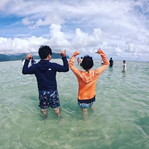 船上で1日の流れの説明を聞くのですが、すでに漫談状態で、皆んなニコニコ。10分程度で天国の海サンドバーへ到着!初めは、みんな船から降りてプカプカ浮いたり、綺麗な海を歩いたり。