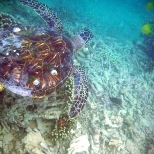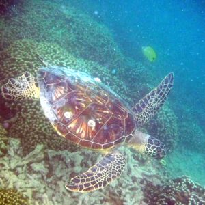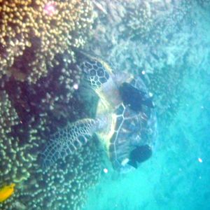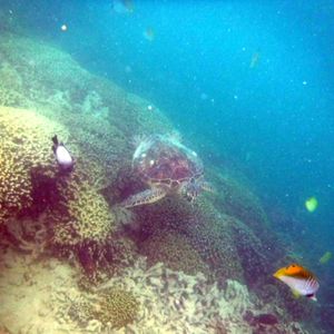 停泊している船の近くを泳ぐウミガメを到着してすぐに見ることができ、シュノーケリングでは海底のサンゴの上で休んでいるウミガメとたくさんの魚を見ることができました。