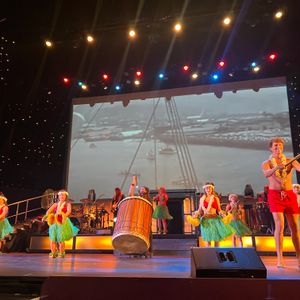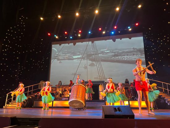 This is a non-traditional show set in a large, comfortable amphitheater on the top floor of a shopping plaza. The show opens with a short historical video about the land and people of Hawaii set in 1920, which sets the timeline for the rest of the performance. From start to finish, the show runs about 1 hour and 10 minutes—just the right length in my opinion.