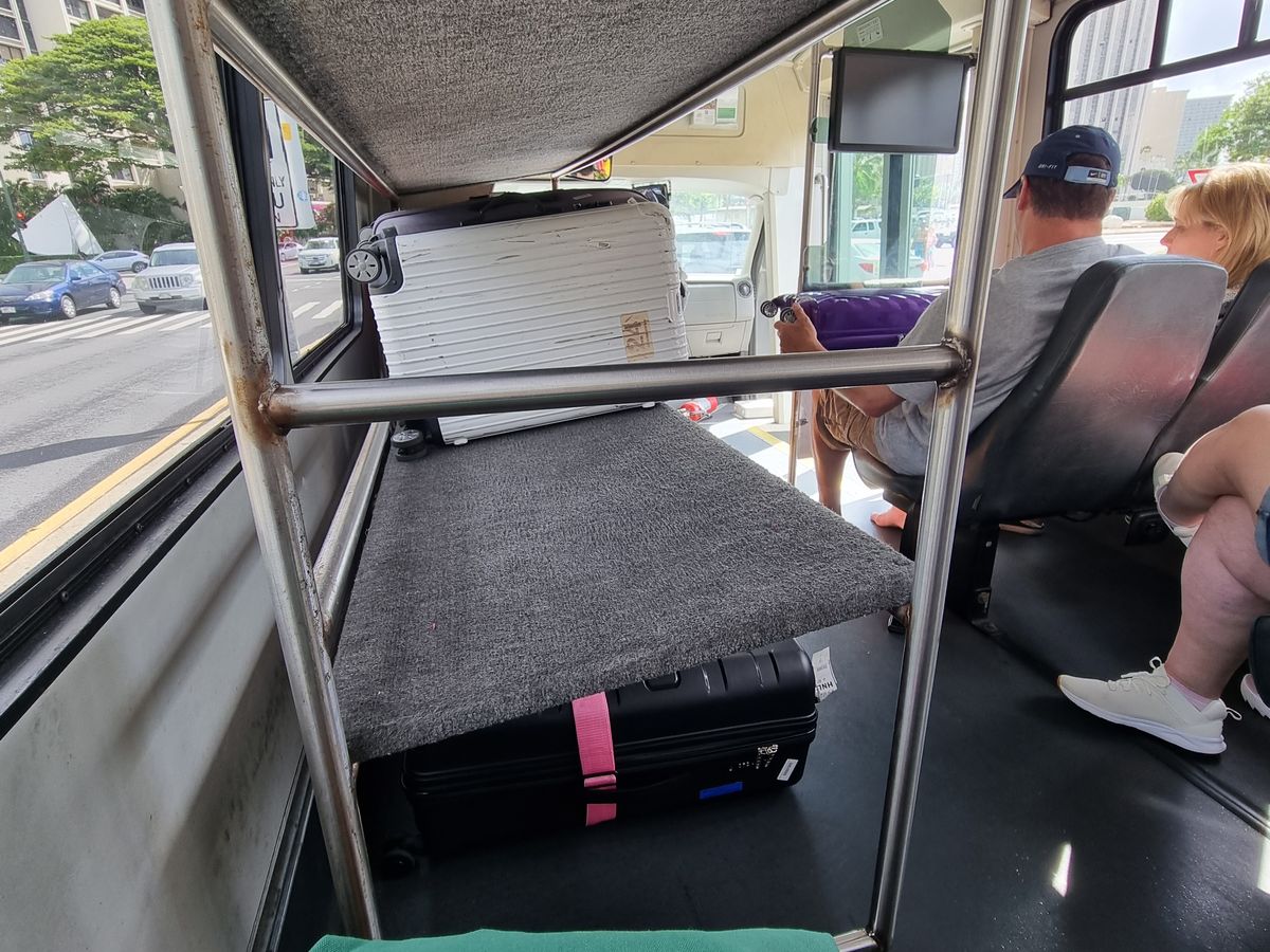 同乗者はそこそこ多く出発ものんびりゆっくりでしたが、これもハワイだなと特別気になるほどではありません。ワイキキでの下車順は運なので早く降りられる時もあれば最後になることも。今回は3番目の下車で比較的早かった方です。スーツケースなどあると混乗バスはやはり安心ですね!