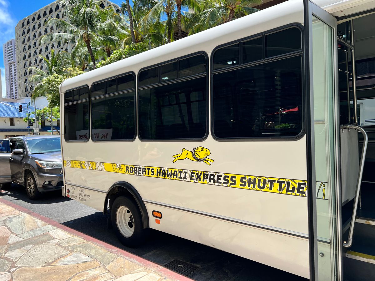 体験日(空港到着日)は個人用出口は空いておらず、団体用出口から出ますが、出てすぐロバーツハワイのカウンターデスクがあります。入国審査時(イミグレーション)別室にて1時間弱ほど質問を受けることになってしまい予定の時間より遅くなってしまったのですが、デスクに行くとすぐに『お待ちしていました!』と名前を呼んでいただき、通常通り何事もなくシャトルに乗ることができました。やはり大手の会社なので安心できるし、カウンターでは日本語も通じるので良いと思います。