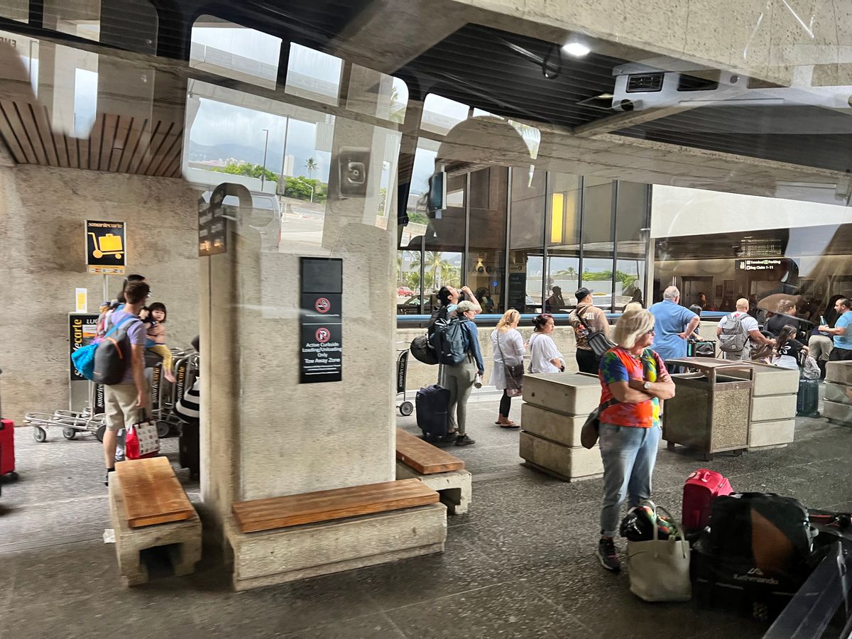 They arrived early, rather than on time, and the operation was smooth afterward. I was relieved not to be anxious since I wasn't sure what the airport would be like during the COVID-19 pandemic. There was a line outside the building for Hawaiian Airlines.