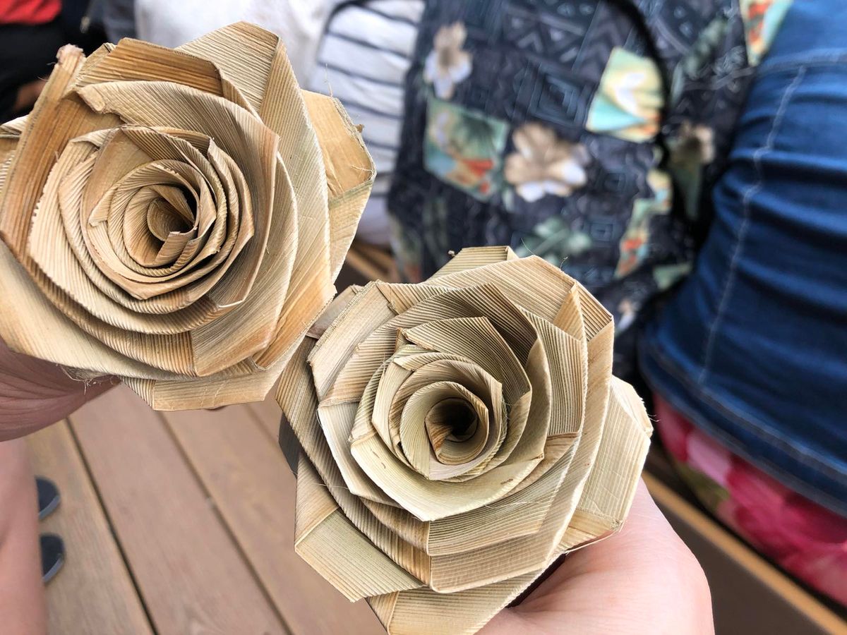 It took about 20 minutes by taxi from Hokulani Waikiki to get there, costing $35 with HANA Taxi. On the way back, it was also $35 to Ala Moana Shopping Center. Since we arrived too early, we sat on a bench and found free Wi-Fi. We flew with JAL this time, so the Rainbow Trolley didn't stop at the Bishop Museum, and I reserved a taxi for the return trip, but it would have been better not to. This is because there was a café called Café Leria, and there were many other things to see. The three-story building had an elevator, so my elderly mother was able to tour it. The guide was an older lady named Noriko, who briefly introduced various plant names and showed us around the museum. I was clumsy with the lauhala weaving, so Noriko helped me, but my 85-year-old mother was able to make it on her own.
