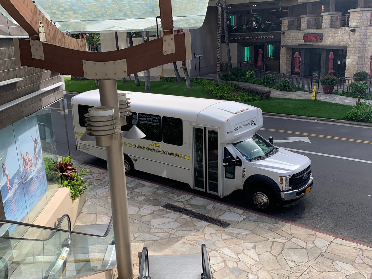 ハワイ島から国内線で到着後、バスに案内されかなり待たされました。(他のフライト客を待つため)バスはぎゅうぎゅうになり、各ホテルへ向かいました。車内は英語でドライバーさんの案内で雰囲気も良くサービスに不満はありませんが、空港着からホテルまでトータル2時間近くの時間を考えると若干の値段差なら一律40ドルのタクシーを利用した方がいいと思います。3人以上ならタクシーの方が得です。