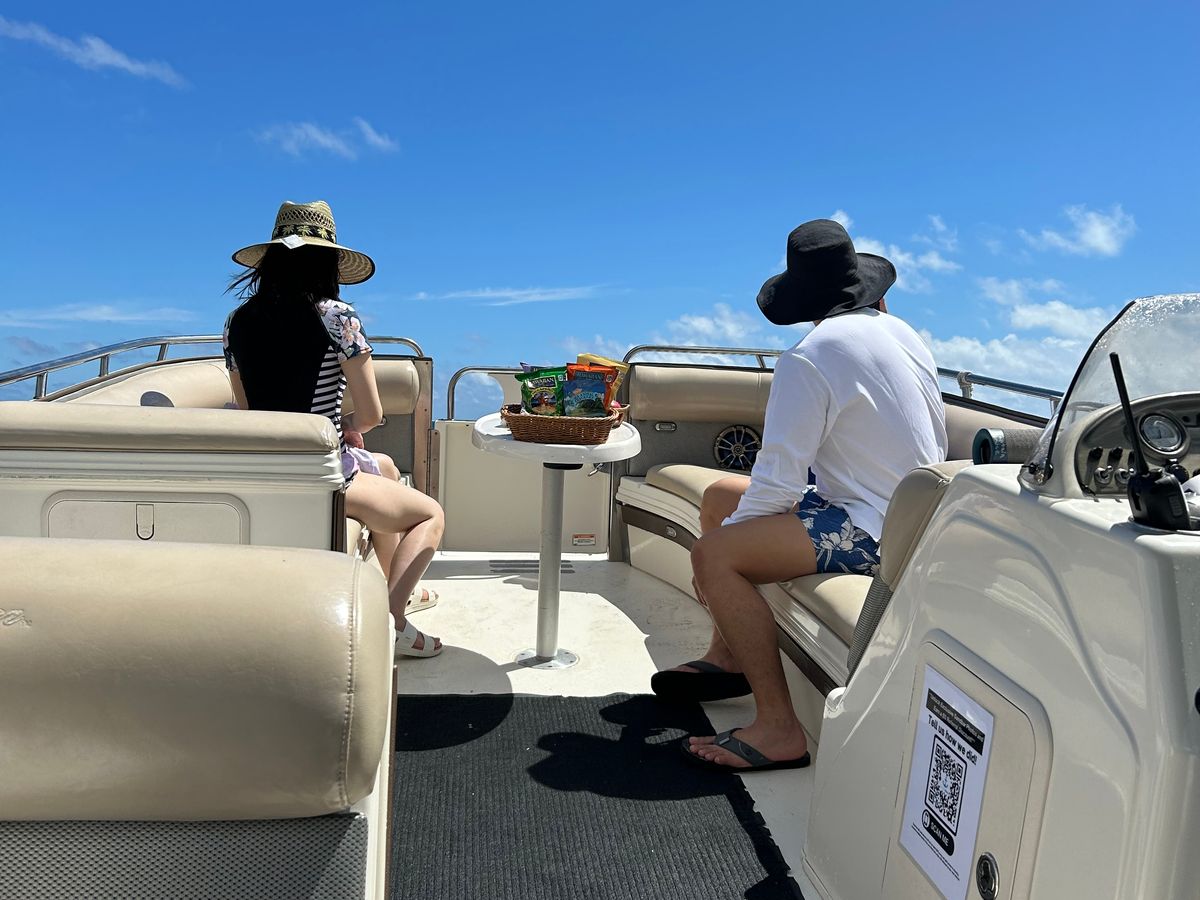 The weather is everything. If you've decided to participate in this activity, you should reflect on your daily actions, pray for clear skies, and wait for that day with a pure heart. We fell short in our efforts and ended up with a cloudy day. If you wish to have a pickup, just let them know your hotel, and they will usually come to pick you up nearby. We were staying at the Royal Hawaiian, so we arranged to meet in front of Ross across the street. We took a bus to the pier and then boarded the ship! Onboard, we filled out a liability waiver and set off for about a 20-minute sail. My mother-in-law, who is prone to seasickness, seemed to be in good spirits, which added to the sense of stability. Donuts and drinks are first come, first served. By the time we returned, the donuts were sold out. I have no complaints about the sandbar itself. You can relax on the boat or enjoy kayaking and stand-up paddleboarding. On the day we participated, it was quite windy, and we could hardly see any fish or turtles.