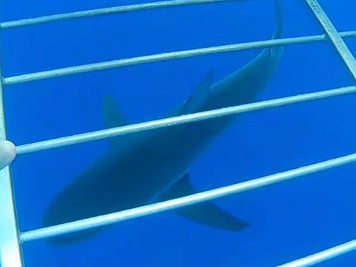 We arrived at the point about 20 minutes after departure, and many sharks gathered around the boat. When we arrived at the point, the waves were high, and I thought motion sickness medication was essential. Each group of 7-8 people entered the cage. I brought an underwater camera, but due to the waves, I couldn't take good photos. However, I was moved by the sight of sharks gracefully swimming right in front of me.