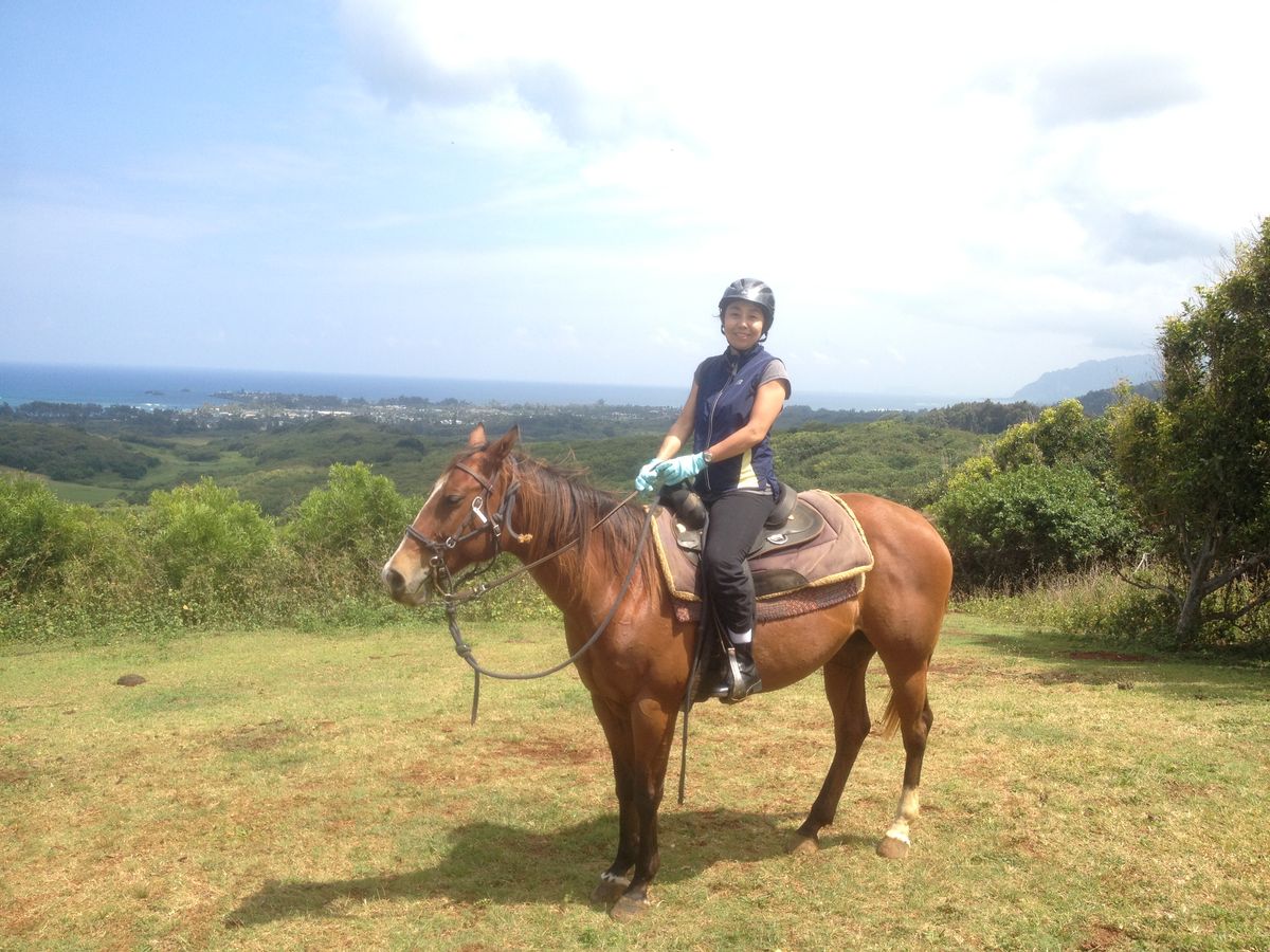 皆さんの評価を見て、まだ初心者で40鞍ほどレッスンを終えたばかりの私が参加しても迷惑かなあ、と思いつつ、しかしハワイの平原を馬で駆けてみたい誘惑に勝てず、恐る恐る申し込みました。結果はチャレンジして正解、とても楽しい時間を過ごすことが出来ました。普段はリング内でしか駆け足しないので、トレイルでの駆け足は初めてだし、ウェスタンの鞍や、片手で手綱を操作する方式も初めてでしたが、ガイドのエミリーさんが親切に教えてくれ、イングリッシュ乗馬よりも手綱を緩めるというコツを教わってからは、馬のLibbyちゃんが調子良く走り始めて、軽快なトロットやカンターで丘を駆け上がり、頂上では海と空とオアフの大地が見渡せる素敵な景色が。上級者でなくても、駆け足が出来るようになったら、ぜひ挑戦してみて欲しいです。きっと更に乗馬の魅力が発見出来ますよ。