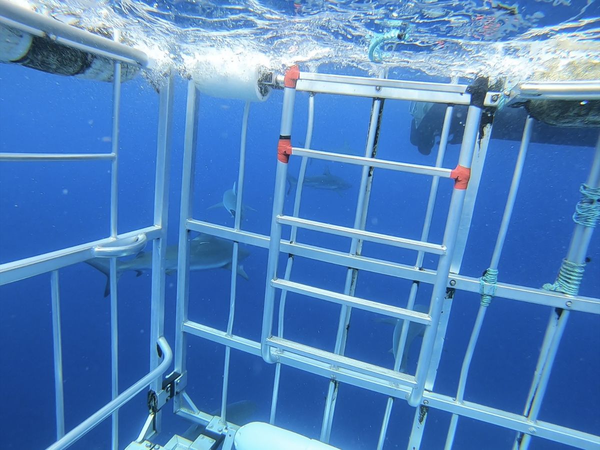 朝9時半スタートの回に参加しました。現地集合、30分前にチェックインとのことでしたので、時間に余裕を持ってワイキキのホテルを朝7時にレンタカーで出発、ハレイワへ向かいました。ワイキキからフリーウェイまでは多少混みますが後はスイスイ、8時過ぎにはノースショア辺りへ到着、ハレイワのセブンイレブンに寄り朝食をとりました。(日本のセブンに近いパスタや手巻き、サンドイッチが売られています。)8時半にはハーバーの駐車場へ到着。好きな駐車スペースへ停めた後『North Shore Adventures』と書かれた小さな小屋で受付です。ラストネーム(苗字)を伝えると英語で「船にはトイレが無いからあそこの茶色い建物で済ませておくこと」、「時間までピンクの小屋周辺で待機すること」など伝えられます。ちなみにこちらの催行会社では船を4隻所有しており、『海王』や『危ない』など日本語の名前が付いています。今回は『乾杯』という船でしたが、たまたま運よくキャプテンが熊本出身の日本語の方(おそらくReeseさん、違っていたらごめんなさい。)で終始日本語で対応して頂けました。全員揃い次第、時間前でも出航です。サンダルを脱いで黒い箱に入れ裸足で乗船、好きな席へ座ります。その後スタッフから英語で説明、主に「船でのルール」「サメの説明」「グループ分け」についてです。今回は私たち以外は全員外国の方で全部で12名、6名ずつの2グループに分けられました。出航から現場まで15分ほど、あっという間に到着します。皆さん書いている通りかなり揺れますので酔い止め必須です。(走行時はそうでも無いですがエンジン停止後と、ケージが海面のため波の影響をもろに受ける)。もし忘れた場合、ワイキキには24時間営業のドラッグストア(Longs Drugs)がありますのでそこで「motion sickness」で探せば見つかります。シュノーケル着用後、GoProを持ってケージの中へハシゴで降ります。サメはかなりの数います。次から次へと目の前を通り過ぎるので、焦らずしっかり体勢を整えてから動画撮影開始です。おとなしい種類のサメですのでもちろん襲ってきたりはしません。約20分ほど楽しんだ後次グループと交代、船へ上がって待機です。船には更衣室はありませんので、水着のまま帰路に付きます。今回は帰港時11:30、出航から帰港まで約2時間の大変コンパクトなアクティビティでした。午前早目の回を選べば午後はまるまる空きますのでハレイワタウン散策やお買い物、海岸線をドライブなど有意義な1日を過ごせると思います。総合的に今回のオアフ島旅行で一番の思い出になりました。かなりお勧めだと思います。ありがとうございました。