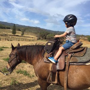 家族5人です。妻と私(60歳以上)・息子2人・娘1人全員大人ですが初乗馬ドキドキしていましたが、1組前に7歳くらいの子供が乗っていたのを見て安心しました。場所はルート83の左側に案内看板があり左折すればすぐです。道路沿いにも牧場が見えます。オフイスが集合場所となっていますが、牧場内に案内看板はなく、とりあえず建物がある奥へ行き、数台駐車している場所があったので行くと、そこに小さな小屋のようなオフイスがありました。常設の係員はいなく、前の乗馬組が戻ってからそのガイドの方が受付をしてくれました。1時間の乗馬で牧場内の丘を登ったり、木の間をすり抜けたりみんな満足していました。小さなショルダーバック・ポーチはつけたままでも乗馬OKでした。残念ながら海辺の乗馬はありませんでした。