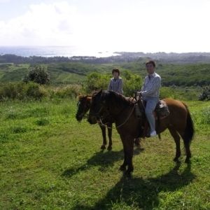 Date of participation: March 19, 2007 (Monday). We participated as a couple. Gunstock Ranch is about an hour and a half by car from Waikiki, located beyond the Polynesian Cultural Center. The area is lush and green, quite different from the rocky terrain of the Big Island, making it suitable for horseback riding. We gathered at 8:30 in the morning. It was just the two of us participating. After the rain, the greenery and rainbow were beautiful. We signed some documents, learned the basics of horseback riding, and mounted our horses. We proceeded with three horses into the greenery. Along the way, the female guide asked, "RUN?" and when I answered "YES," we started to gallop. The horse I rode was well-trained and very responsive. Since it was a horse that wanted to run, I hardly had to kick it at all. We mostly galloped except for the climbs and descents to the hill and some slippery red dirt areas. The trees on both sides formed an arch, and we moved through it at a comfortable speed. The guide picked guava fruit for us, which was sour and delicious. When we reached the top of the hill, we had a 360-degree view. We could see the ocean as well. The wind felt nice, and the view was amazing. The hour flew by. It was a lot of fun.
