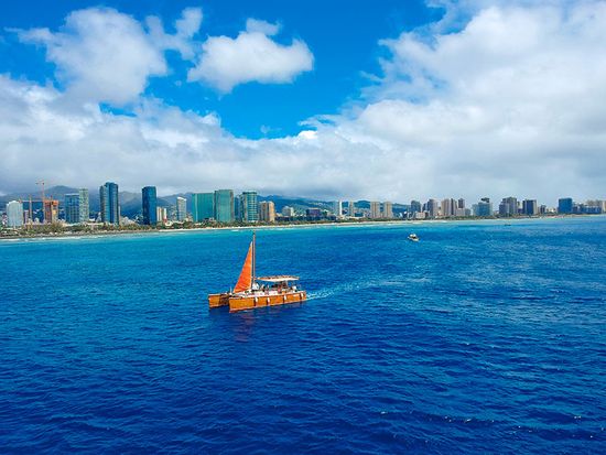 Head out on a 2-hour Waikiki cruise, learn about Hawaii's history, experience hands-on cultural activities & food tasting! Enjoy ukulele music and experience how Polynesians traveled across the Pacific Ocean in an authentic Polynesian sailing canoe.