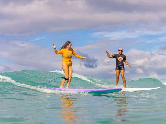 • Learn to surf in Waikiki with a certified instructor, shared between two students for a private group experience.