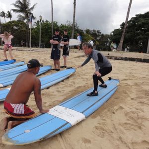 ワイキキのカピオラニ公園近くでのサーフィンでした。インストラクターは現地の人でしたが、ちゃんと顔と名前をすぐ覚えくれて、必要な指示はカタコトの日本語でしてくれました。私以外は全員初心者だったので、インストラクターは波に乗る時ボードを押してくれていました。私にはちょっと物足りなかったかな。波乗りしてる写真も撮ってくれたので記念に買いました。いい記念です。
