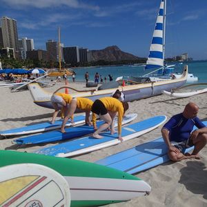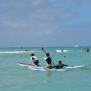 妻と参加しました。初めてのスタンドアップパドルでしたが、とても楽しめました。冬のワイキキビーチは、カイルアなどと比べると波も穏やかだし、水は澄んでいて、サンゴやウミガメが見えたりして、初心者には最高の場所かも知れません。ホテルからも歩いてすぐの距離にあって、レッスンも短時間なので本当に"体験"するにはオススメです。唯一、不満を挙げるとすると、写真撮影付きとは言え、実際に撮影してくれたのはレッスンの初めの10分間くらいなので、慣れてきた頃の"カッコいい"写真は撮って貰えなかったところです。折角だったら、レッスンの初めと終わりのそれぞれ5分間を撮って貰えたら大満足の5スターでした。