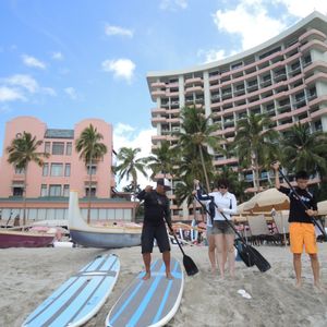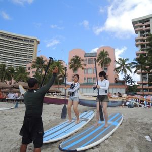 On July 30, I participated in the "Stand-Up Paddle Beginner Plan." On the day of the event, I arrived at the meeting point by the poolside of the Royal Hawaiian Hotel at 9:30. After checking in, I waited until the lesson started at 10:00. The staff provided some instructions, and the lesson began. It was my first experience with stand-up paddle surfing, and we started with a simulation on land before finally heading into the ocean. I was nervous at first, but gradually got used to it and was able to stand up and paddle. It was an hour-long lesson that flew by.