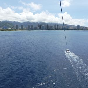 ピックアップが15分程度遅れて少し焦った。ドライバー、キャプテン、ガイドみんな片言の日本語は話せる。舩に乗るとベルトを装着(全部やってくれるので足を通すだけ)し、ハーネスの説明(全部英語、ものすごく大事な赤の糸を触るな、ハーネスに触れるな、は日本語あり)をしたあと、結構すぐに一組目から飛び上がります。飛び上がり始めるポイントに行くまでの舩の操縦もアトラクションのようでスリル満点。飛び立つと眼下に海、目の前にはワイキキの町並み。本当にきれいで感動。海へのドロップは結構濡れる。写真は100枚以上撮影してくれて30ドル、SDカードで配布。頼んだ方がお得。船着き場までの帰りの舩の操縦もアトラクションのようで楽しい。船酔いする人は酔い止めを。