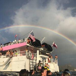 There are various sunset cruises, but I chose this one because it also offers water activities. There were hardly any Japanese people, but it was more fun than I imagined! Two cute dogs greeted us. I'm not great with animals, but they were very calm, so it was totally fine. We jumped into the sea from the boat using a slide and floated on a float! We were lucky to see a big double rainbow! Drinks are available for a fee starting at $3. I enjoyed a cocktail. It says no outside food or drink, but there were people with their own bottles. There's a shop in the harbor waiting area after check-in, so some people bought shave ice or soft serve and ate while boarding. There are plenty of floats to attach around your waist, so even if you're not a strong swimmer, I think you'll enjoy it. Please make sure to wear a swimsuit!