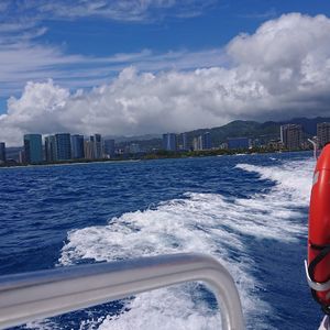 昨年に続き二回目の参加でした。陽気なスタッフにより、あっと云う間に上空150mへ。青い海を眼下にワイキキビーチやダイヤモンドヘッドを眺めながら、爽快な飛行です。帰路は海の上を跳ねるように全速で港へ戻ります。また体験したくなります。