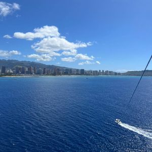 絶景を楽しむことが出来ました。浮遊時間は約8分ほど。綺麗な海はもちろん、ワイキキ市街やダイヤモンドヘッドを高いところから見ることが出来ました。ボートは思ったよりも置きに進み、船の時間も楽しむことが出来ました。パラセーリングは150mを選択しましたが想像以上に高く、風に煽られると若干の恐怖心もありながら、絶景を楽しむことが出来ました。意外にも長く感じるほど景色を楽しめました。あれほど高いところから優雅にワイキキの景色を楽しめることは無いのでおすすめです。スタッフの方も大変優しく陽気な方々でした。