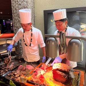 It took a bit to get to the top of the building but it was worth it. We got there and they were very helpful. Greeted up with a lei and took us to our table. Gave us our drink order (non alcoholic) and took our picture. The line up of food was quite amazing! All kinds of food to please everyone's liking. They also had dessert. It rained pretty good so they were able to cover the side so we didn't get wet. After dessert we we inside to watch the Rock a hula. And it was awesome. Elvis and Michael Jackson preformed along with the amazing hula dancers. It ended with an amazing fire show! It was well worth it! Go see it