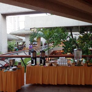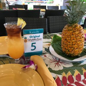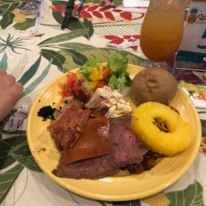 ビュッフェ形式のお食事は、ハワイらしいメニューになっており、意外と滞在中に口にする機会のなさそうなものを頂くことができ、嬉しかったです。また、まるごとのパイナップルや、ウェルカムドリンクでマイタイのサービスなどもあり、とても楽しめました。また、お食事中にフラダンスを間近で見ることができ、貴重な時間でした。新婚旅行で伺いましたが、席ごとにウクレレの演奏もしていただき、嬉しかったです。