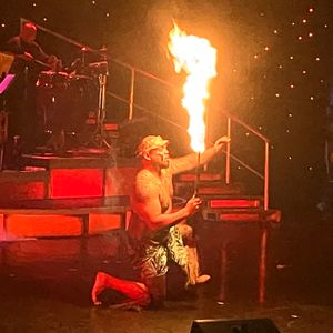 今回妻との旅行でしたが、前回会社の旅行で2017年のホノルルマラソンに参加する為、ワイキキに宿泊。その時に今回のショーを見て楽しかったので、妻に見せたいと思い予約をしました。当日ブュッフェをつけましたが端っこの席で、少し雨が降って来た為、濡れてしまいました。ふとスカイワイキキの方向を見ると大きな虹が見えて、とてもラッキーな日でした。