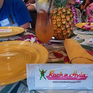 Once inside, I received a lei greeting and took a commemorative photo, then headed to my seat with a Mai Tai in hand! All the seating is communal, so I chatted with guests from the mainland who were sitting nearby while enjoying the welcome music and hula dance on stage.