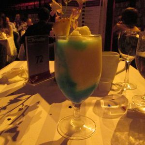 ディナーはステージの前に設けられたテーブル。料理はロブスターとステーキですごく美味しいわけではないが無難な味だった。アルコールは1杯だけ無料でその後は有料。ブルーハワイを頼んだら10ドルだった。