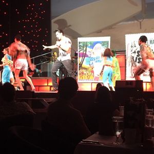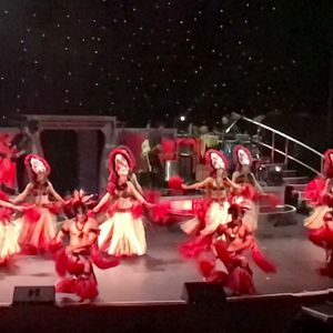 入場後、前室でカクテルとチップとフルーツがいただけます。ショーの会場に入場後、食事が始まります。その後、ショーが始まります。ダンサーが天井から登場したり、意表を突かれます。プレスリーとマイケルのショーはわかりますが、ケイティーのショーは残念ながら曲がわかりませんでした。フラのショーも船上で行っているものよりも人数が多く迫力のあるものでした。