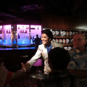 まずグリーンルームに3グループ10人だけが案内され、カクテルとちょっとしたおつまみ・果物のサービスを受け、挨拶に来てくれたエルビスのそっくりさんと各グループづつ写真を撮ってもらいました。(この写真はツアー料金に含まれっており、私たちはショー終了後にエルビスにサインもしてもらいました。)