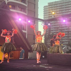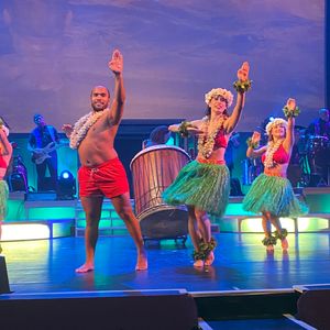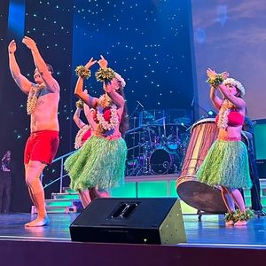以前もフラのショーを見たのですが、また違ったエンターテイメントショーでした! VIPタイプで申し込みましたが、行ってすぐから生レイのプレゼント。今は空港でwelcome!みたいなのがなくなってたので、ここでハワイ的な気分になりました。食事が集合時間40分後くらいしてからのスタートでしたが、マイタイのドリンク(アルコール有り無しを選べる)を飲みながら待つことが出来ました。マイタイさっぱりしてておいしかった。他にはコーヒーやパイナップルなどもいただけて、ウクレレを弾いてくれるスタッフの方も居たりで、待つ時間も有意義。スタートしたあとは、ビュッフェ&フラ!ビュッフェはお肉多めのメニューですが、最後にデザートとかも出て、なかなかお腹いっぱいになりました。VIPタイプはもう一杯ドリンクが無料で付いてたので、私はビール、母はノンアルコール。母のノンアルドリンクはココナッツがきいていて甘かったみたいです。食事の間にフラダンスとフラlesson!そのあと場所を移動してからのエンターテイメントショー! 最初からドキドキで楽しめました✨ マイケルとかみんなが聞いたことはあるかなって曲をやってくれるので、英語がいまいちの人でもなんとなくでも楽しめるかと思います。ガッツリ分かる人だと、もっと楽しめる ショー終わった後に写真を一緒に撮ってもらいましたが、いい思い出になりました。