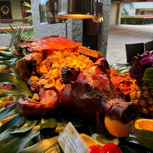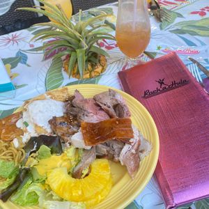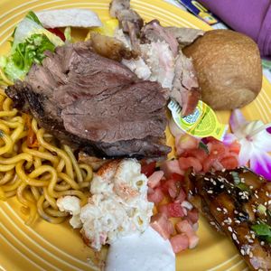 The meal included roast beef, roast pork, lomi lomi salmon, and fried noodles, which the kids really liked. There were also desserts like fruits and cake, which were satisfying.