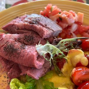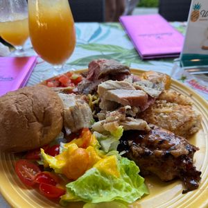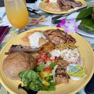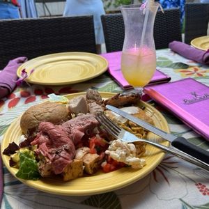 First, we started with the welcome drink, a Mai Tai. The meal included three types of meat: chicken, pork, and beef, all of which were delicious. The salad was also fantastic, made with my favorite romaine lettuce. I reached my limit there, but my wife was thrilled with the dessert, which was filled with cakes, and she was very satisfied.