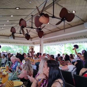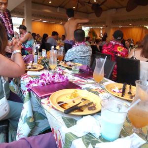 I participated in a luau dinner. Groups are guided to their seats in the order they arrive. The dinner seating is outdoors under a roof, and the evening Hawaiian breeze was pleasant.