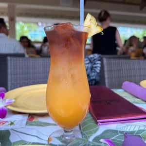 First, a Hawaiian drink called Mai Tai is served. You can choose between alcohol or no alcohol, and they leave your preferred option. I chose the non-alcoholic version, and it was sweet and delicious. In front of us was a hollowed-out pineapple, which we shared with the eight people around us. After that, we had to wait quite a while until it was time to get our meals. The food was served buffet-style, with options like grilled chicken, white fish dishes, roasted sweet potatoes, and salads. There were staff members slicing roasted pig and roast beef a little further ahead, so be careful not to take too much from the buffet, or you might not be able to finish it. Desserts and coffee were also available, and everything was quite tasty.