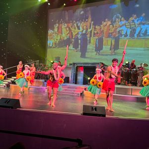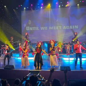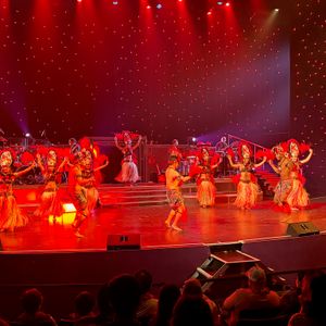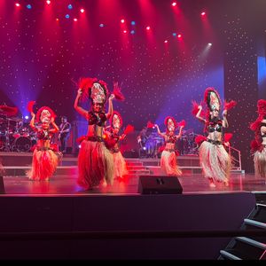 During the meal, someone came with a ukulele to sing Hawaiian songs, and they also performed hula dancing. The atmosphere was great, and they were skilled. Those who wished could participate in a hula dance class on the spot, which was quite fun. After managing the choreography, I high-fived other travelers from different countries at our table. After that, we were guided to the theater. I recommend using the restroom around dessert time. The theater is as cool as the reviews say, so you’ll need something to cover up.