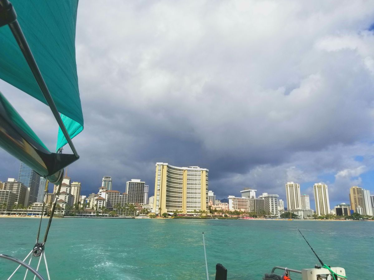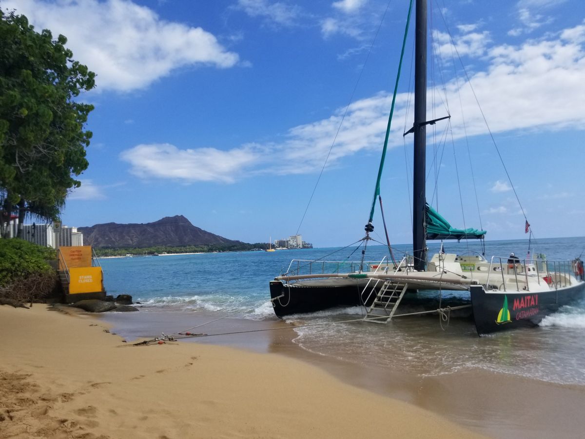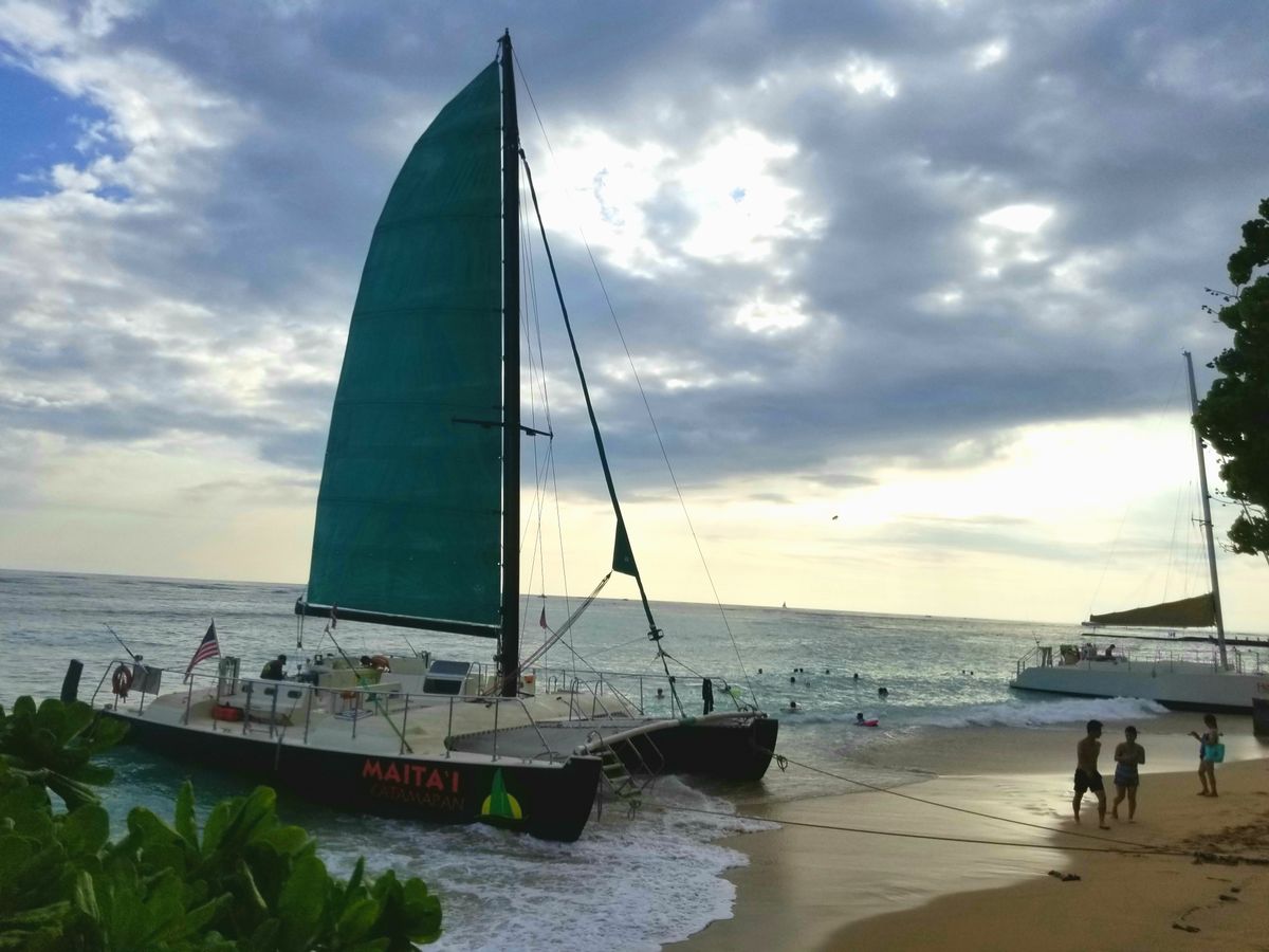 We sailed smoothly off the coast of Waikiki on a catamaran, enjoying the wind. While sipping on a Mai Tai made by a female crew member with a large tattoo, we waited for the sunset. When the sun finally dipped below the horizon, applause erupted all around us.
