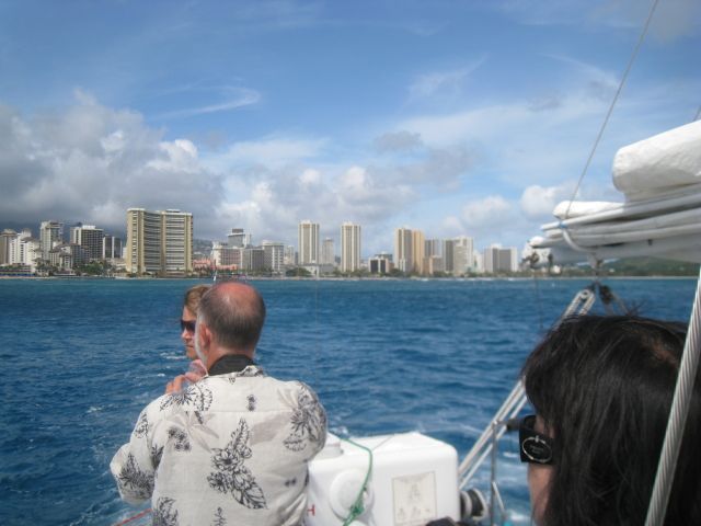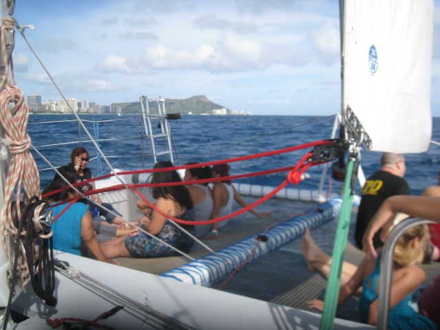 妻と2人で参加しました。カタマラン号の停泊場所は、アウトリガーホテルとハレクラニホテルの敷地間のビーチへ続く舗装道があって、そこを通ると目の前でした。参加者は20数名、日本人は私たちだけでしたが特に問題なし。足元が濡れるので水着の状態で出航準備。英語で案内があって、サンダルを預かってもらって裸足で乗船。私は船に酔いやすいので、急いで中心の帆柱の横に座りました。午後3時出発のツアーで幸い天気もよく、出航してすぐ海中に海カメのシルエットを発見。沖に出ると次第におだやかだった海も波が高くなり、ちょっとした遊園地のアトラクションのようでした。他の客は波を被るたびにキャッキャ言っていました。沖から見るワイキキビーチ、ダイヤモンドヘッドの景色は爽快で、良い思い出となりました。総合評価で満点5つ☆にしなかったのは、ビーチへ帰るときに、長い間海水を被って少し冷えてテンションが下がってしまったことです。帆先に座るとよく濡れるので水着が良いと思いますが、船長近くの場所であれば、濡れることも少ないと思います。