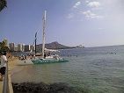 オアフ島、到着日の15:00に参加しました。ハワイ島から11:30に着いたので時間的にも余裕がありました。14:30分にアウトリガー・リーフ・オン・ザ・ビーチホテルのビーチ側にいくと同じような船の案内のパラソルがありますが青い文字のアウトリガー・ カタマラン号の看板が出てるところにおにいさんがいてすぐにわかりました。日本語も上手でしたよ。(わかるように写真を添えています。)カタマランは初めてなのでとても楽しみにしていました。船は弱いほうなので少し心配していましたが揺れも少なく心地よい風とワイキキやダイアモンドヘッドなどの景色を見ながらのクルージングはなんとも言い難い心地よさで時間のたつのも忘れるくらいです。クルーの人もみんなに声をかけてくれて日本人は私と妻だけでしたが浮くこともなく楽しむことができました。途中クジラを見たり、魚にえさをあげたりと飽きることなく楽しむことができました。中ではカクテルを作ってくれます。外国の人はみんなおいしそうに飲んでいました。オアフに来た時はまたぜひ乗りに行きたいと思います。子供さんも大丈夫ですよ。
