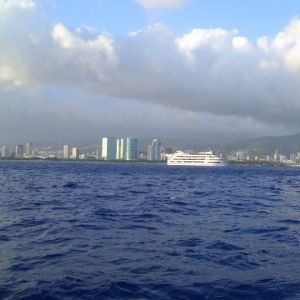 ハワイ到着日に参加しましたが、あいにくの曇り空でかなり気落ちしていました。ところが動力を切って帆走を始めると、波に揺れながら気持ちよい風を受けて気分も盛り上がってきました。