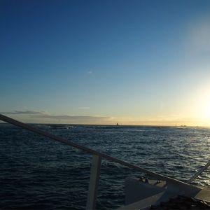 船のそれぞれの場所に腰をかけて、潮風を感じながら、見る夕日は今まで見た夕日の中で一番きれいでした。海に映える夕日の色がいいですね。