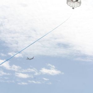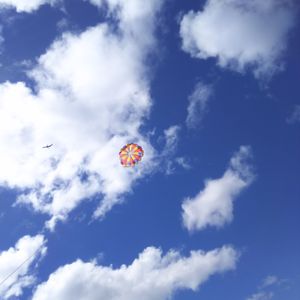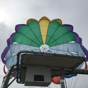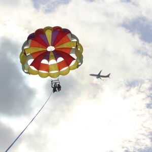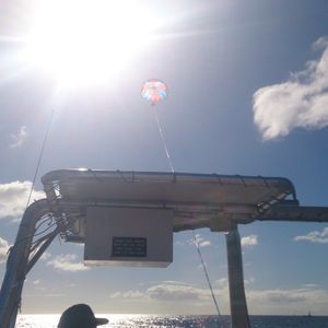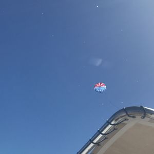 ボートの端に誘導され、パラシュートをつないだと思ったらあっという間に浮き上がり、はるか上空へ。1番高い150mを希望してましたが、思ったより怖くなく、風に揺られてふわふわと気持ち良いです。なにより、ボートにいるみんなが手を振ってくれたり拍手で讃えてくれるので、気分が上がります。