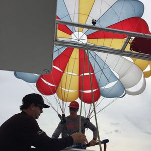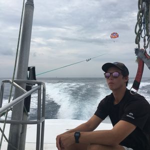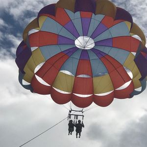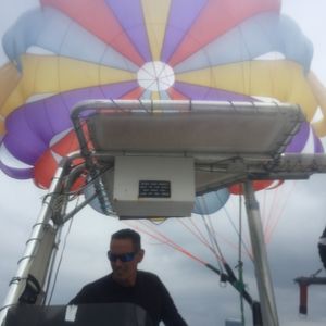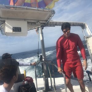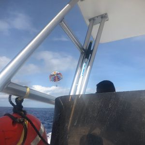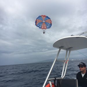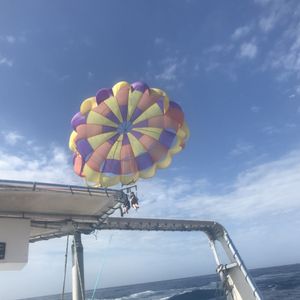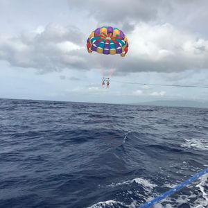 ちょっと小雨が降る中のパラセイリングだったので、タブルの虹をバックに写真を撮ることが出来て最高でした。何より一番上に着いたときに後ろを振り返ると円形の虹を見ることがでしました。初めての経験だったので、良い思い出になりました。説明が大事なこと以外は全部英語の説明で不安になることもありましたが、船酔いした友達に気づいて素早く対応していただいたことにはとても助かりました。ありがとうございます。ただ、集合時間20分位過ぎてからのお迎えでちょっと不安にさせられました。