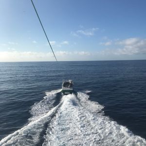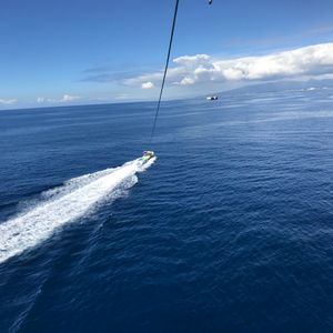 ご厚意で、空から船へ紐を引っ張って戻るとき海にバシャバシャッと付けてもらいました。沖に出るまでの時間もジェットスキーみたいで楽しいです。